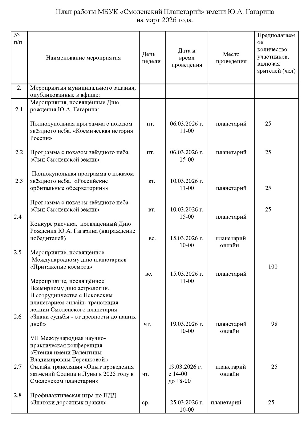 План работы МБУК «Смоленский Планетарий» имени Ю.А. Гагарина на март 2026 года.