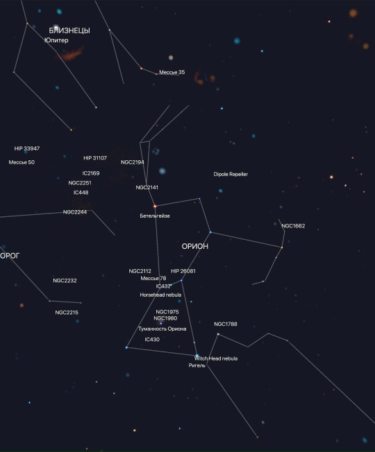 На этом захватывающем снимке центральную часть композиции занимает величественный Орион — одно из самых узнаваемых созвездий зимнего неба северного полушария.